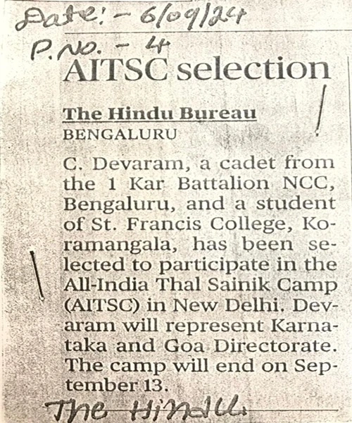 Awarded “Cadet Welfare Society Scholarship” worth Rs. 6,000/- from Bengaluru 'A' Group for her Academic Excellence in the academic year 2023-24.