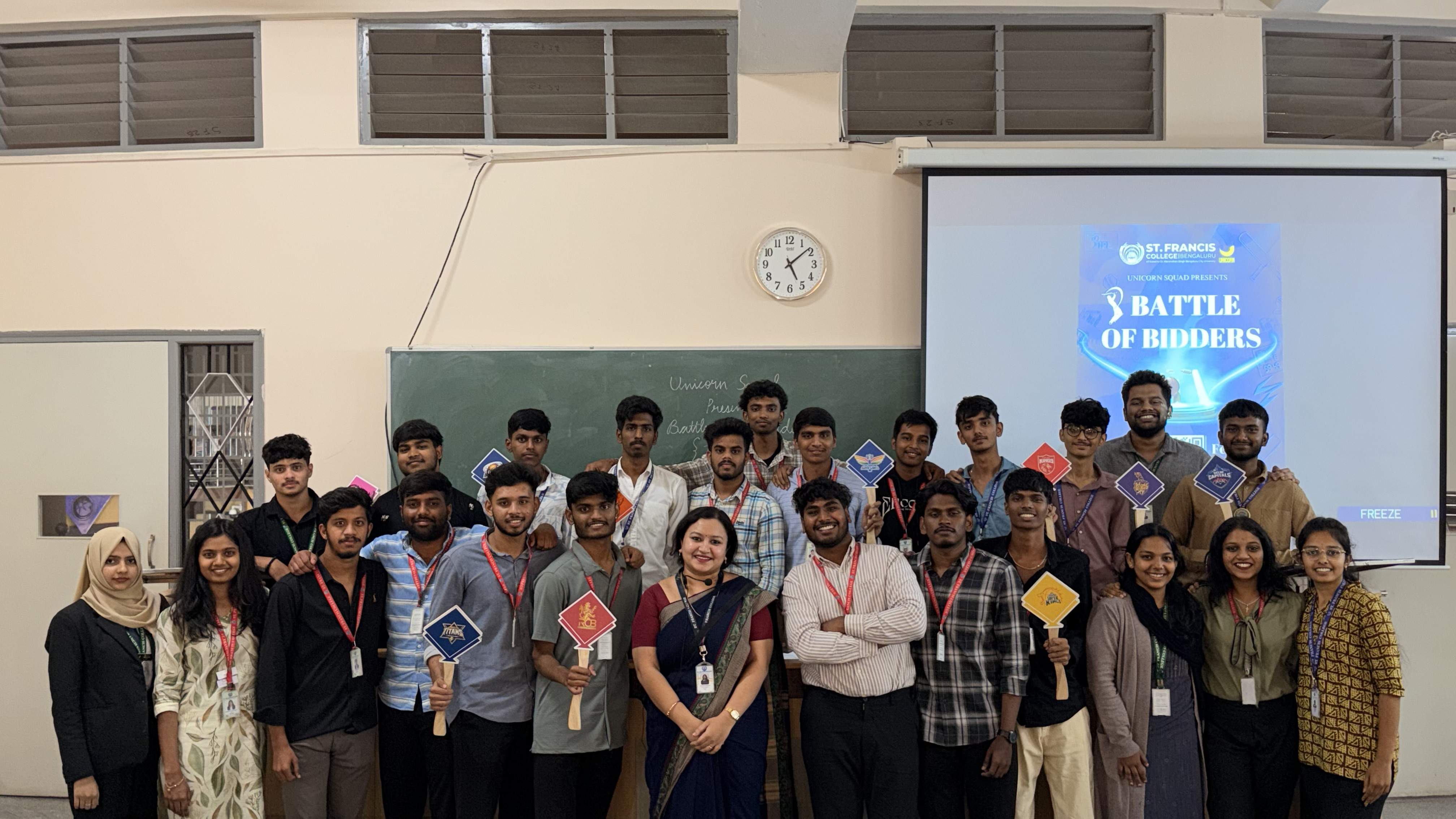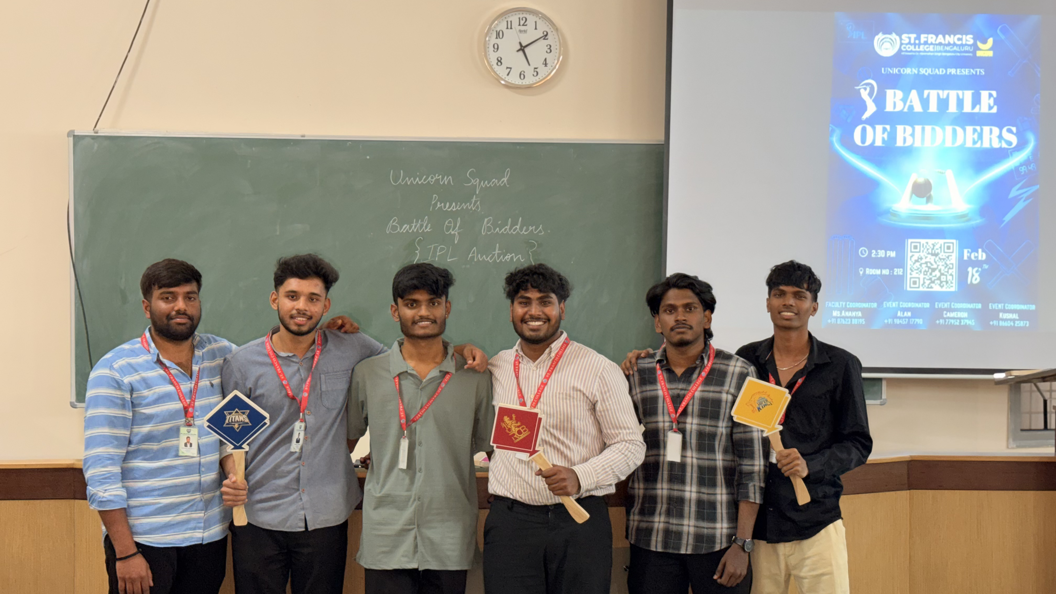 The Battle of Bidders event was conducted as an engaging interclass activity designed to simulate the dynamics of an IPL auction. The programme began with an introduction by the organizers outlining the objectives, rules, and structure of the event. Participants were grouped into teams representing franchises and oriented about the two rounds designed to test both knowledge and strategic decision-making skills.