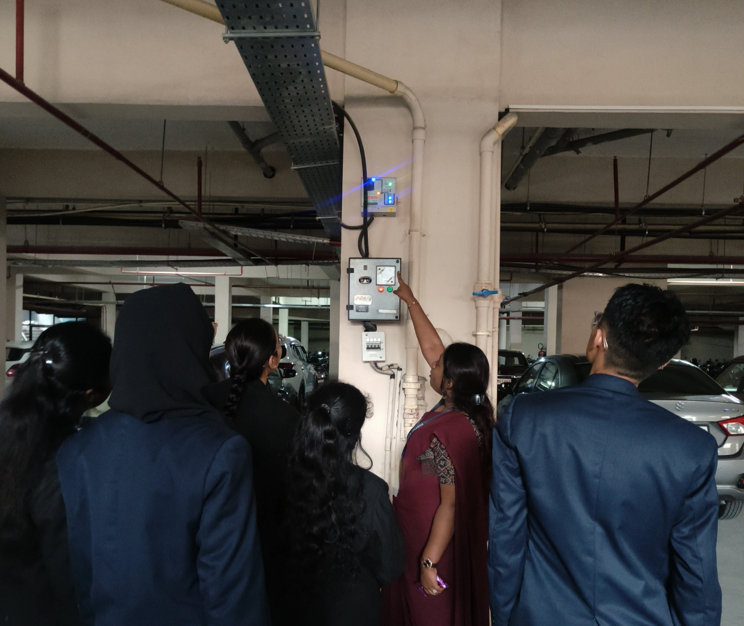 The site visit began with a brief introduction to the fundamental components of building services and their importance in creating comfortable, safe, and functional interior environments. The students were introduced to various interior services such as plumbing, lighting, electrical systems, HVAC, and their role in efficient building performance. This initial briefing helped students understand how these services are integrated into interior design projects.Following the introduction, students were guided through different areas of the campus to observe real-time applications of plumbing layouts, lighting systems, and HVAC installations. Special attention was given to the working process of the Sewage Treatment Plant (STP), where students learned about sustainable water management practices, wastewater treatment, and water reuse systems implemented within the campus.During the walkthrough, students closely observed and analyzed the placement of ducts, lighting fixtures, electrical panels, cable trays, and piping systems. Faculty members encouraged interactive discussions, helping students relate these observations to theoretical concepts studied in the classroom. This hands-on learning approach enhanced students’ understanding of service coordination, spatial planning, and technical integration in interior design projects. Overall, the visit provided valuable practical exposure and strengthened the students’ ability to connect academic knowledge with real-world applications.