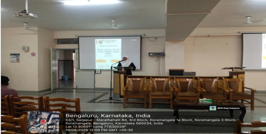 The Demo on Full Stack Development using MERN was conducted on 19 August 2025 at St. Francis College, organized by the Department of BCA in association with Techbyheart and IQAC. The session was handled by Mr. Priyansu Naskar and Mr. Mohammed Mubasir from Techbyheart. The demo introduced students to end-to-end web application development using the MERN stack (MongoDB, Express.js, React, and Node.js). Participants gained practical insights into integrating front-end and back-end technologies, database connectivity, and building dynamic web applications. The interactive session enhanced students’ understanding of full stack development and motivated them to pursue hands-on projects and career opportunities in web development.