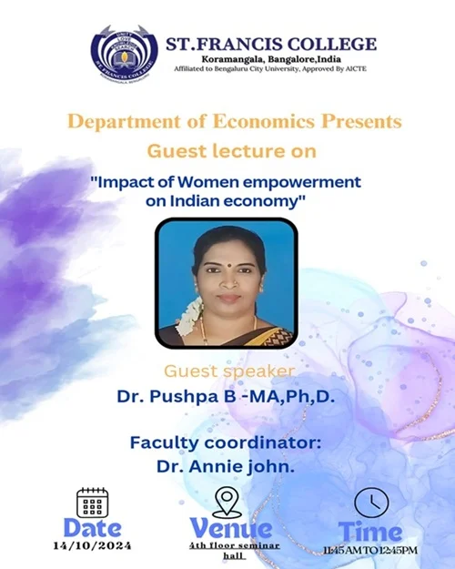The Department of Economics organized a guest lecture on Monday, 14 October 2024. The programme began with an introduction by Reema Rose (II Year BA). The guest speaker addressed the topic of women empowerment and its impact on the Indian economy, sharing valuable insights with the students.The session lasted for one hour and included meaningful interaction between the students and the speaker. The guest was honoured by the faculty coordinator, Dr. Annie John, with a sapling and an appreciation letter. The event concluded with a vote of thanks by Hiba Mahee (II Year BA).